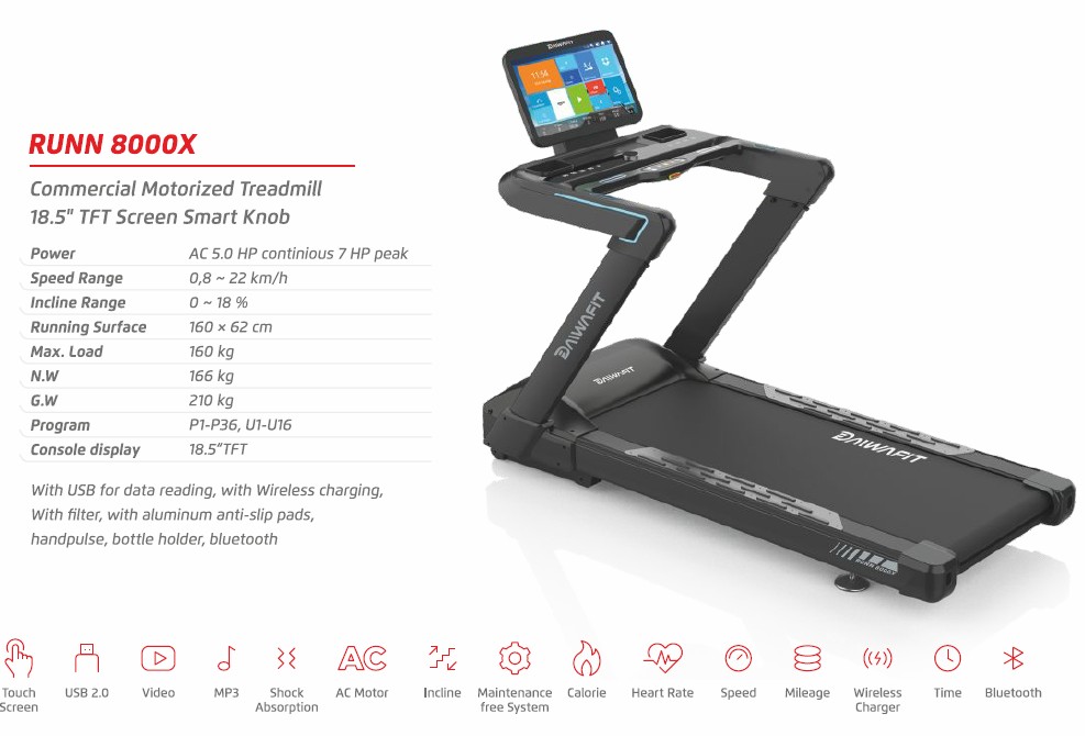 • Commercial Motorized Treadmill 18.5 TFT Screen + LED Smart Knob. AC 5 HP